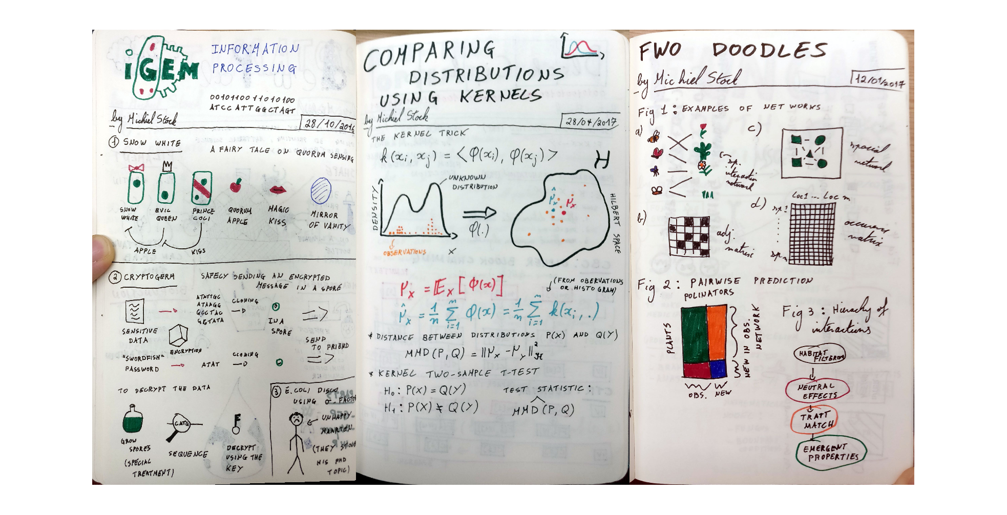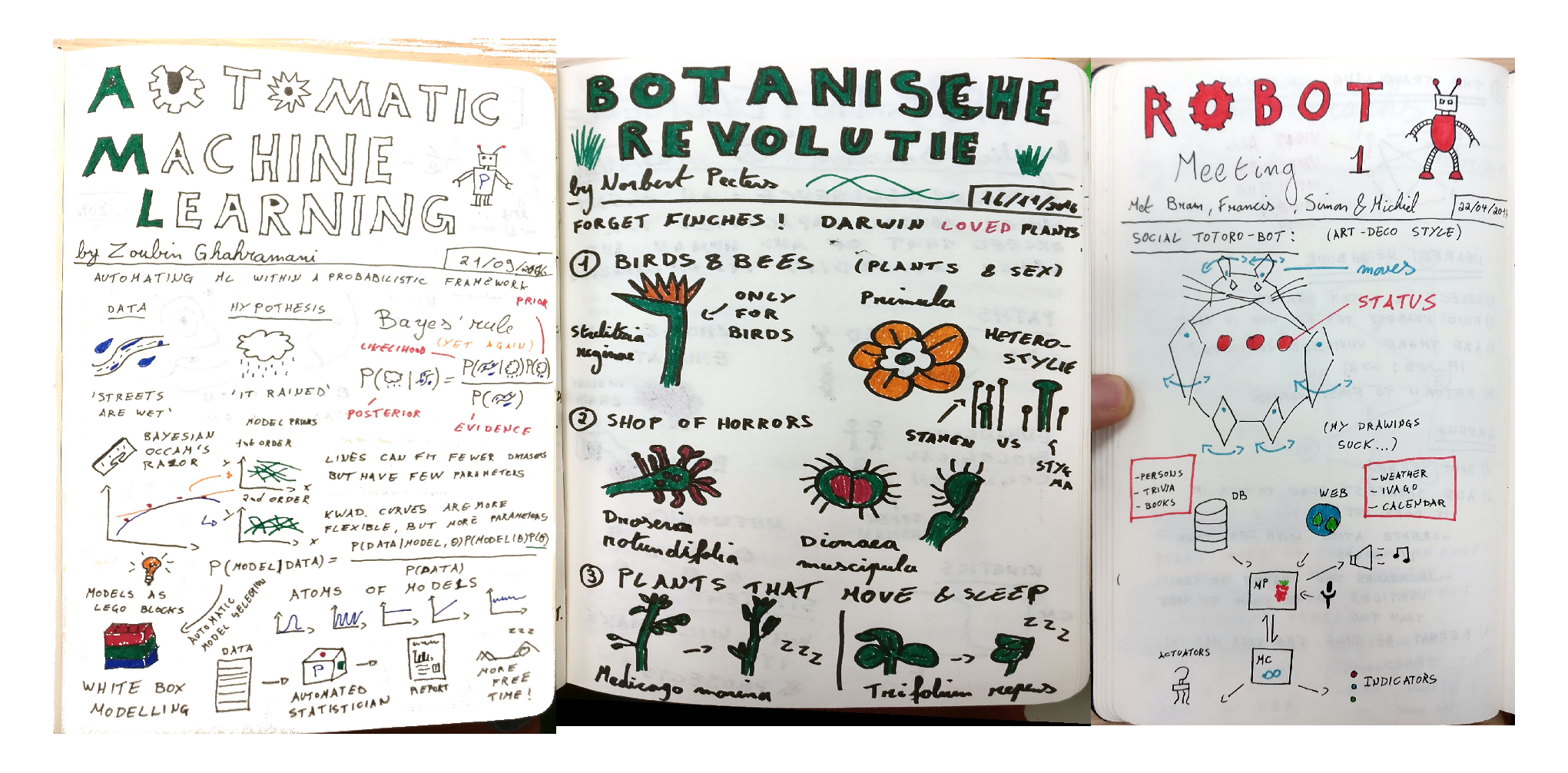 I always thought of myself as being spectacularly bad at drawing. Being friends with Koen van den Eeckhout, who is the official sketchnoter of the Science Café at Ghent, does not help my self esteem. The philosophy of sketchnoting however is to keep the artwork simple and having fun is more important than a crisp end result. Remember, there are only five basic shapes to draw just about anything: point, square, circle, line and triangle. Though I still do not find my drawings very appealing, I do see quite an improvement of my artwork in the last years.