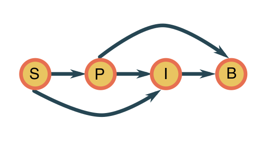 \[ \mathbb{P}(S, P, I, B) = \mathbb{P}(S) \mathbb{P}(P\mid S)\mathbb{P}(I\mid S,P)\mathbb{P}(B\mid P,I)\,, \]