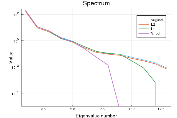 A look at the spectrum of all matrices shows that the nuclear norm results in low-rank matrices.