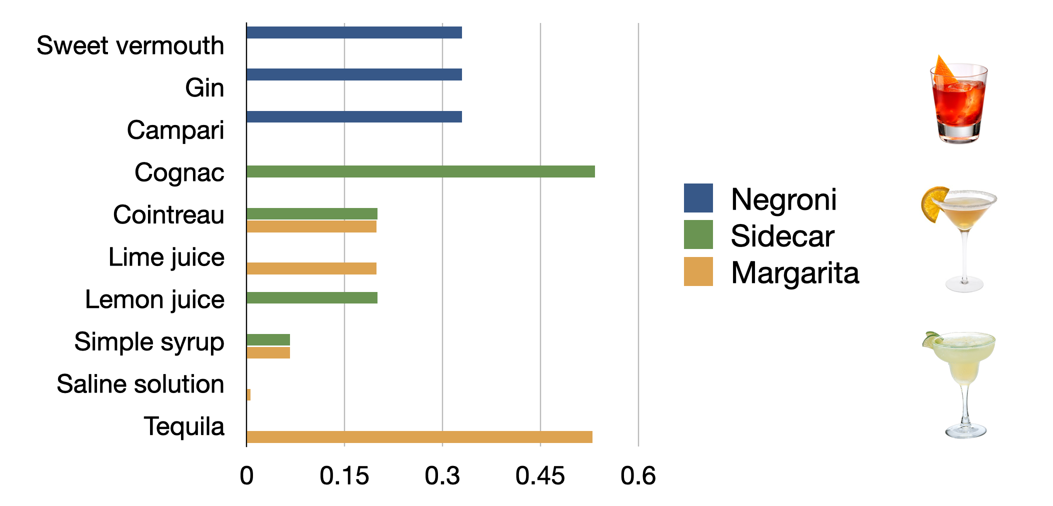 So cocktail recipes are compositional data, and we have to analyze them as such. There are hence three essential aspects to a cocktail recipe: