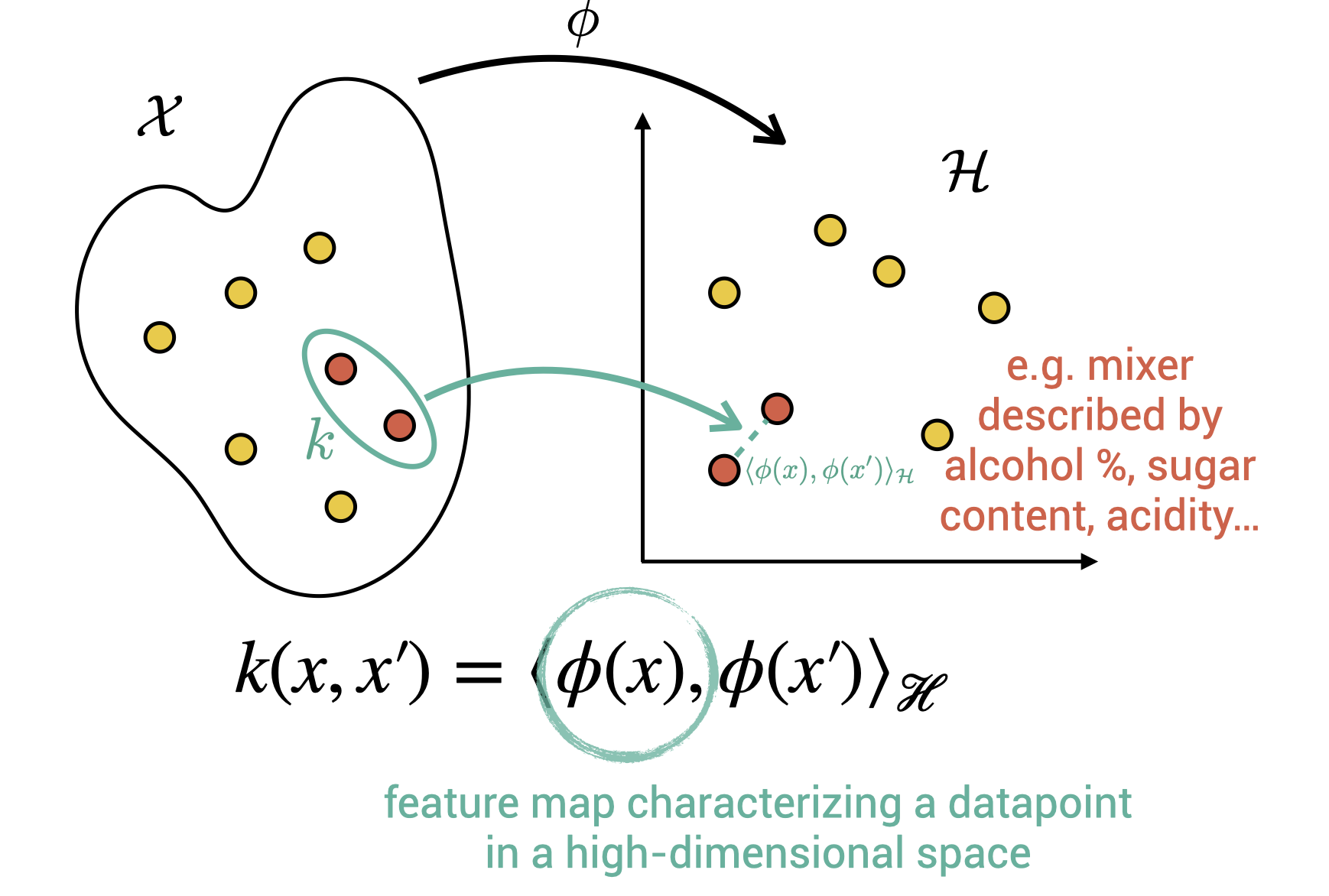Given that there is not a lot of cocktail data but that we expect there to be a nonlinear effect on how the mixers interact, kernels seem an appropriate tool! Without losing ourselves into the details, kernels are a way to represent data points in a high-dimensional Hilbert space. Think of a mixer, which can be described by alcohol and sugar content, acidity, type (liquor, sweetener, etc.). We can think of a feature map \(\phi\) where we perform a nonlinear expansion of all these variables, projecting the mixer in a high-dimensional space. A kernel function is used to implicitly define such space. It represents a dot product in this space.