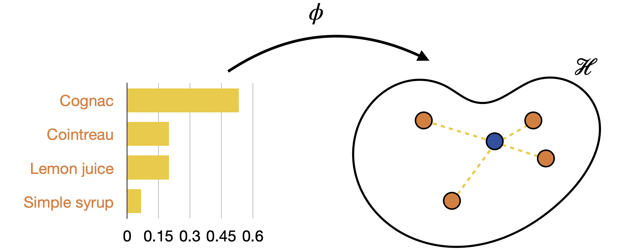 We now can describe the mixers, how to represent the cocktails. To this end, we can use kernel mean embedding, an elegant framework to represent probability distributions (i.e., compositions) in the Hilbert space. The idea is as smart as it is simple, to embed a cocktail, just take the weighted sum of the embeddings of the mixers: