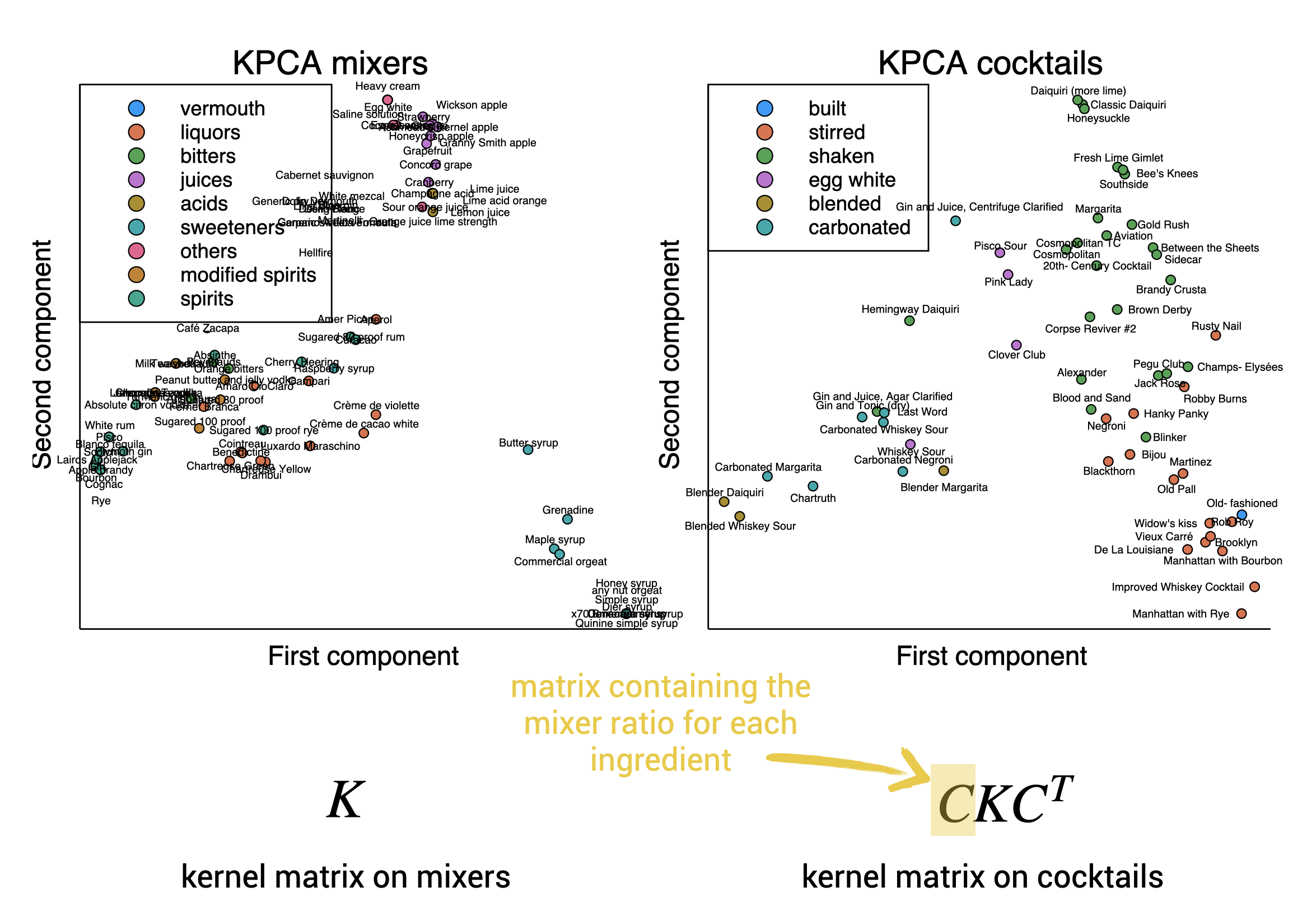 Looking pretty good! We have successfully represented cocktails as points in a Hilbert space. Note that the cocktails cluster quite well by type of mixing. Such a vectorial description can be used as a fruitful basis for all kinds of supervised and unsupervised data analysis!