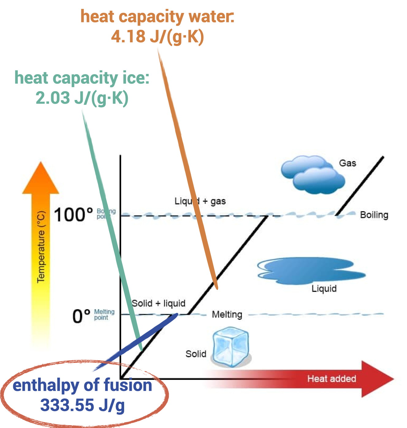 - cold water obtained from molten ice increases its temperature to the cocktail equilibrium temperature, this amounts to 4.1814 J/(g·K);
