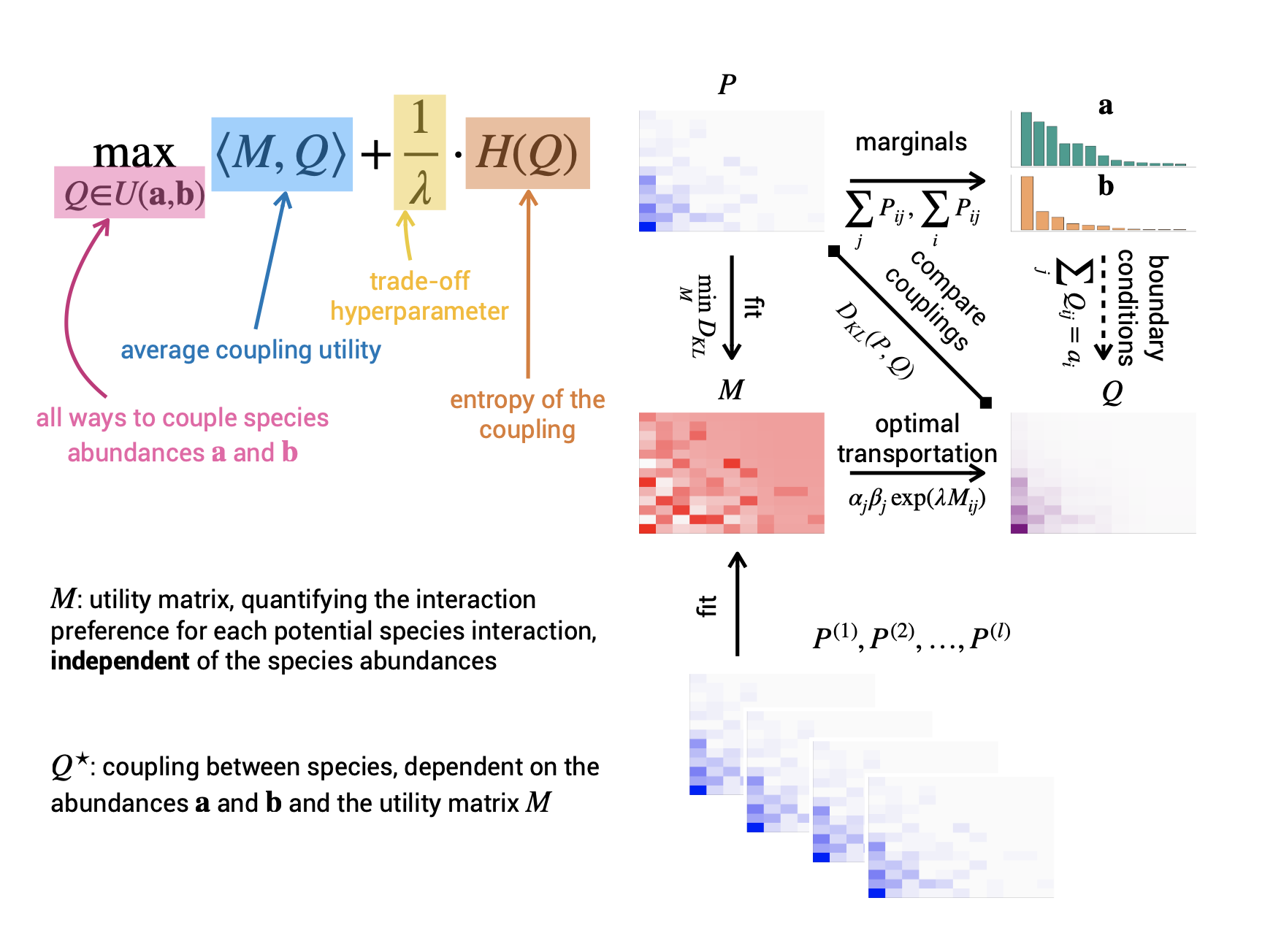 Maybe some ecologists are sceptical about how solving an optimization problem for the ecosystem might be justified. Are not all species only doing the optimal only for themselves and not the system? Well, our OT framework can be motivated as a maximum entropy (MaxEnt) model! Natural phenomena love to create entropy, and MaxEnt has been used successfully throughout the sciences (the Ideal Gas Law can be derived from it). Given two levels of species abundances and no preferences of one species for another, MaxEnt would predict the interaction strength between two species is proportional to their respective abundances. This so-called neutral model is already an excellent baseline in practice! The only addition to our model is that we add a linear functional of the interactions, saying that some are preferred over others2. In a sense, ours is the simplest possible Maxent model that uses information about interactions. We show that our OT solution arises naturally from species-level decisions, given that there is an element of randomness in the system.